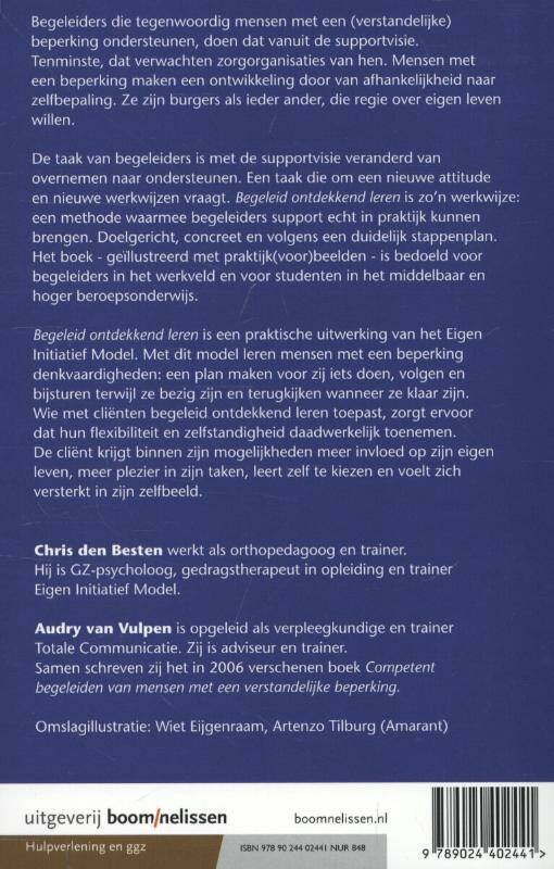 De taak van begeleiders is met de supportvisie veranderd van overnemen naar ondersteunen. Een taak die om een nieuwe attitude en nieuwe werkwijzen vraagt. Begeleid ontdekkend leren is zo'n werkwijze: een methode waarmee begeleiders support echt in praktijk kunnen brengen. Doelgericht, concreet en volgens een duidelijk stappenplan. Het boek - geïllustreerd met praktijk(voor)beelden in tekst en beeld - is bedoeld voor begeleiders in het werkveld en voor studenten in het middelbaar en hoger beroepsonderwijs.