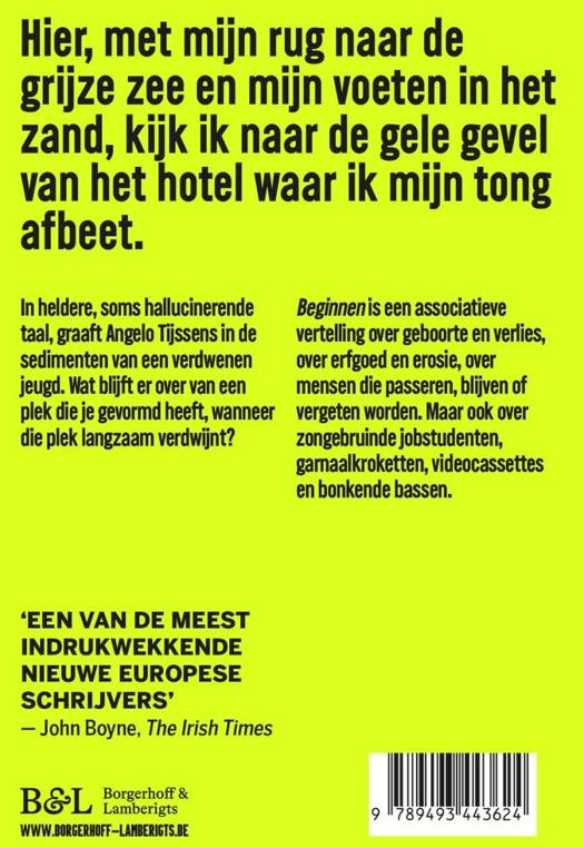 Beginnen is een associatieve vertelling over geboorte en verlies, over erfgoed en erosie, over mensen die passeren, blijven of vergeten worden. Maar ook over zongebruinde jobstudenten, garnaalkroketten, videocassettes en bonkende bassen.