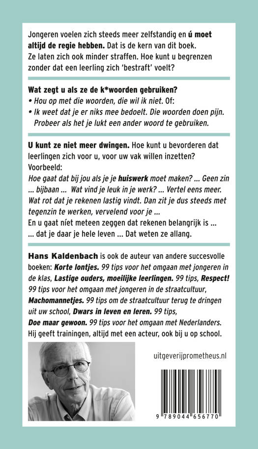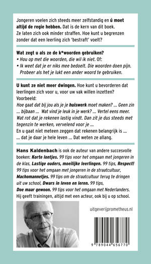 Hans Kaldenbach is ook de auteur van andere succesvolle boeken: Korte lontjes. 99 tips voor het omgaan met jongeren in de klas, Lastige ouders, moeilijke leerlingen. 99 tips, Respect! 99 tips voor het omgaan met jongeren in de straatcultuur, Machomannetjes. 99 tips om de straatcultuur terug te dringen uit uw school, Dwars in leven en leren. 99 tips, Doe maar gewoon. 99 tips voor het omgaan met Nederlanders. Hij geeft trainingen, altijd met een acteur, ook bij u op school.