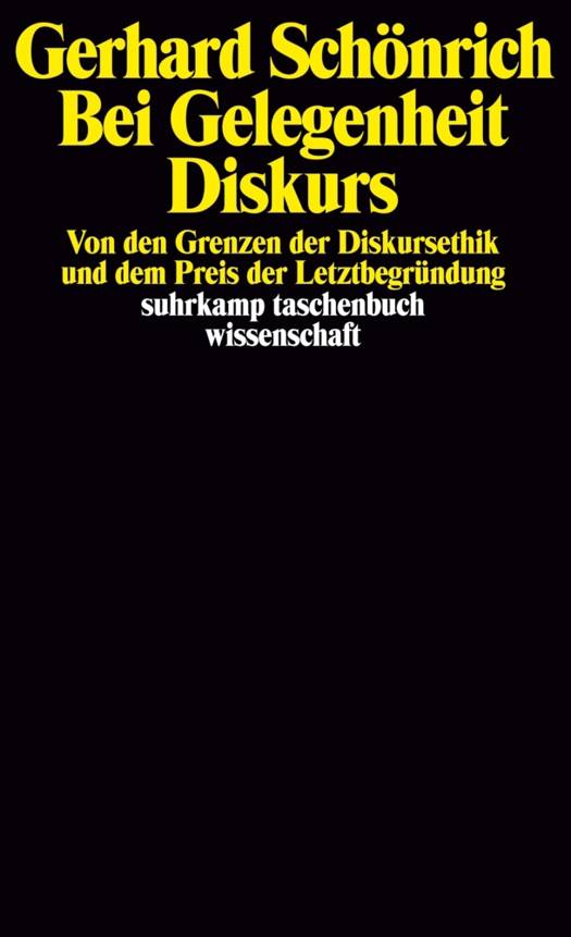 Weder Habermas' duales Konzept der auf die Folgen einer Normbegründung abstellenden Begründungs- und Anwendungsdiskurse noch Apels Entwurf eines Erweiterungsprinzips werden dem erhobenen Anspruch tatsächlich gerecht. An dem immanenten Überhangproblem unmoralischer und zugleich freier Handlungen - dem Problem des Bösen - führt Schönrich vor, wie der im Konzept einer freien Zustimmung zum Diskurs stark gemachte Freiheitsbegriff eine geradezu systemsprengende Dynamik entfaltet. Abschließend wird der (nur von Apel) vertretene Anspruch auf Letztbegründung als ein - jedenfalls mit transzendentalpragmatischen Mitteln - nicht vollständig einlösbarer Anspruch erwiesen.