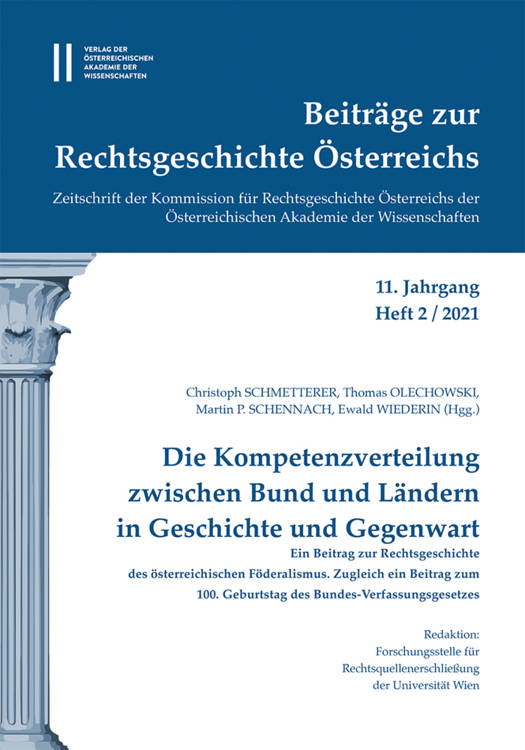 Die "Beitrage zur Rechtsgeschichte Osterreichs" wurden als Zeitschrift der Kommission fur Rechtsgeschichte Osterreichs gegrundet. Seit 2011 erscheinen die "BRGO" zweimal jahrlich sowohl in einer Printfassung als auch online; in der Regel ist ein Band einem besonderen Thema gewidmet, wahrend der zweite Band vermischte Beitrage enthalt. Der aktuelle Band enthalt die Referate der im Fruhjahr 2021 abgehaltenen Tagung "Die Kompetenzverteilung zwischen Bund und Landern in Geschichte und Gegenwart. Ein Beitrag zur Rechtsgeschichte des osterreichischen Foderalismus. Zugleich ein Beitrag zum 100. Geburtstag des Bundes-Verfassungsgesetzes". Nach Grussworten der Bundesministerinnen fur Verfassung und fur Justiz sowie einem Vorwort der Herausgeber (Ch. Schmetterer, Th. Olechowski, M. Schennach und E. Wiederin) wird das Heft mit einer "Theorie der Kompetenzverteilung" (M. Jestaedt) eroffnet. Die Geschichte der Kompetenzverteilung in den USA (R. Lhotta), in Deutschland (J.-D. Kuhne, Ch. Gusy) sowie in der Schweiz (B. Schindler) umrahmt die ausfuhrliche Darstellung der osterreichischen Entwicklung. Der Bogen spannt sich dabei von der Monarchie (Th. Simon, Ch. Schmetterer) uber die Zwischenkriegszeit (Ch. Neschwara, Th. Olechowski, St. Hinghofer-Szalkay, G. Kohl, I. Reiter-Zatloukal) bis zur Zweiten Republik, wobei die aktuelle Situation und Reformtendenzen einen Schwerpunkt des Bandes ausmachen (A. Gamper, B. Bussjager, E. Wiederin, C. Jabloner, M. Potacs, S. Schmid).