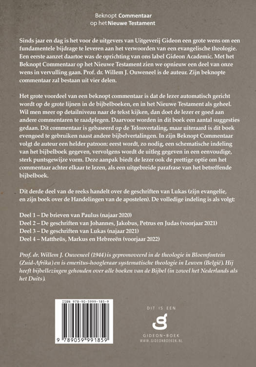 Sinds jaar en dag is het voor de uitgevers van Uitgeverij Gideon een grote wens om een fundamentele bijdrage te leveren aan het verwoorden van een evangelische theologie. Een eerste aanzet daartoe was de oprichting van ons label Gideon Academic. Met het Beknopt Commentaar op het Nieuwe Testament zien we opnieuw een deel van onze wens in vervulling gaan. Prof. dr. Willem J. Ouweneel is de auteur. Zijn beknopte