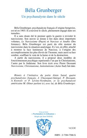 Béla Grun berger, psychanalyste français d'origine hongroise, est né en 1903. Il a traversé le siècle, pleinement engagé dans ses tumultes. Il a sans doute été le premier après la guerre à revisiter le narcissisme. Son œuvre se donne à lire dans deux importants volumes, Le Narcissisme (Payot) et Narcisse et Anubis (Des femmes). Béla Grunberger est parti du rôle moteur du narcissisme dans la situation analytique. Il s'est, en effet, attaché à montrer la face lumineuse de Narcisse, à l'origine des accomplissements les plus élevés de l'homme, mais aussi sa face sombre, soufflant le vent de la haine et de la destruction. A partir du narcissisme, il a proposé deux modèles de fonctionnement psychique représentés l'un par le Christianisme, l'autre par le Judaïsme. Son livre écrit avec Pierre Dessuant Narcissisme, Christianisme, Antisémitisme (Actes Sud) fait date.