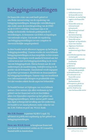 De bundel bestaat uit bijdragen van verschillende auteurs. Deze auteurs zijn allen werkzaam op het gebied van het financieel recht en beschikken allen over bijzondere expertise op het gebied van beleggingsinstellingen. Iedere auteur geeft vanuit zijn eigen achtergrond invulling aan het onderwerp. De bundel is tot stand gekomen onder redactie van mr. E.M. Dieben en prof. mr. W.A.K. Rank.