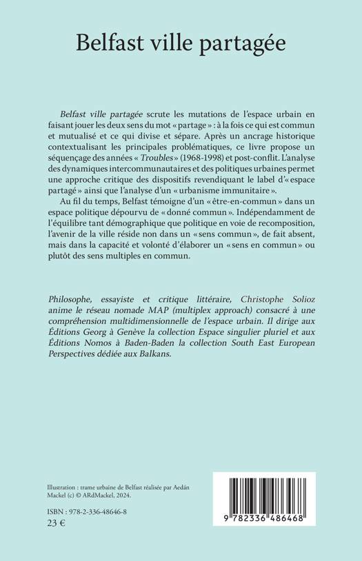 Belfast ville partagée scrute les mutations de l'espace urbain en faisant jouer les deux sens du mot partage à la fois ce qui est commun et mutualisé et ce qui divise et sépare. Après un ancrage historique contextualisant les principales problématiques, ce livre propose un séquençage des années Troubles (1968-1998) et post-conflit. L'analyse des dynamiques intercommunautaires et des politiques urbaines permet une approche critique des dispositifs revendiquant le label d' espace partagé ainsi que l'analyse d'un urbanisme immunitaire . Au fil du temps, Belfast témoigne d'un être-en-commun dans un espace politique dépourvu de donné commun . Indépendamment de l'équilibre tant démographique que politique en voie de recomposition, l'avenir de la ville réside non dans un sens commun, de fait absent, mais dans la capacité et volonté d'élaborer un sens en commun ou plutôt des sens multiples en commun.