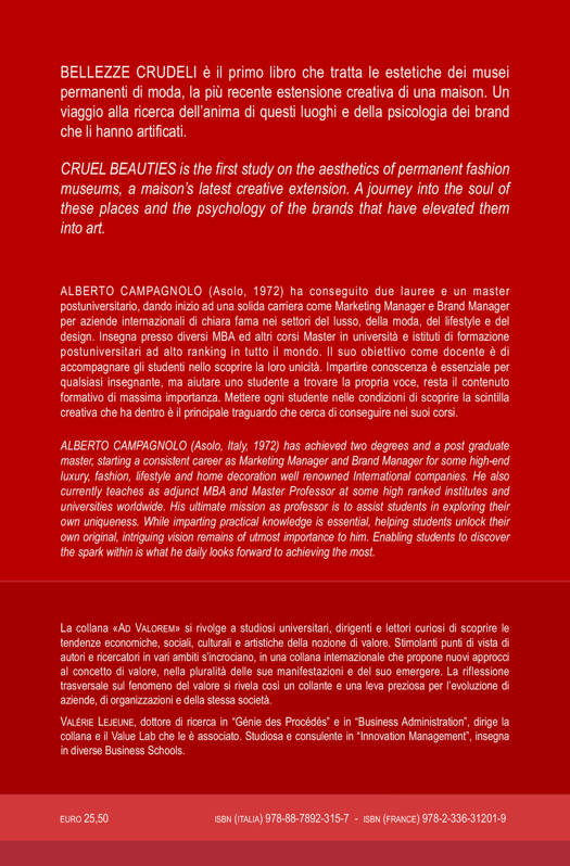 Cet ouvrage bilingue italien-anglais constitue le premier essai consacré à l'esthétique des musées permanents de la mode, soit la modalité créative la plus récente des maisons de haute couture. Il s'agit d'un voyage à la recherche de l'âme de ces lieux et de la psychologie des brands qui les ont conçus. ALBERTO CAMPAGNOLO (Asolo, Italie, 1972), ancien Marketing Manager et Brand Manager pour des entreprises internationales, enseigne actuellement dans plusieurs universités et instituts de formation en Europe et en Asie (MBA et Masters).