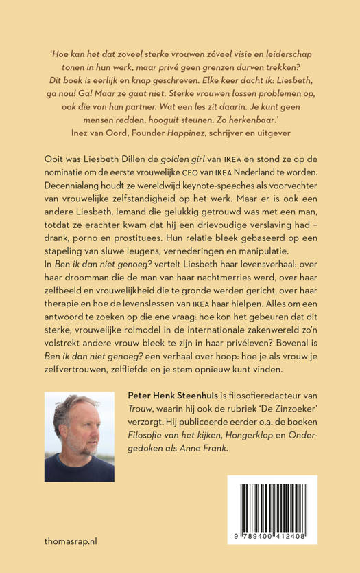 In Ben ik dan niet genoeg? vertelt Liesbeth haar levensverhaal: over haar droomman die de man van haar nachtmerries werd, over haar zelfbeeld en vrouwelijkheid die te gronde werden gericht, over haar therapie en hoe de levenslessen van IKEA haar hielpen. Alles om een antwoord te zoeken op die ene vraag: hoe kon het gebeuren dat dit sterke, vrouwelijke rolmodel in de internationale zakenwereld zo’n volstrekt andere vrouw bleek te zijn in haar privéleven? Bovenal is Ben ik dan niet genoeg? een verhaal over hoop: hoe je als vrouw je zelfvertrouwen, zelfliefde en je stem opnieuw kunt vinden.
