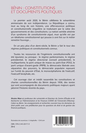 Le 1er août 2020, le Bénin célébrera le soixantième anniversaire de son indépendance. La République a connu, tout au long de son histoire, une effervescence politique et constitutionnelle singulière se traduisant par la valse des gouvernements et des constitutions. Cet ouvrage inédit rassemble les constitutions et chartes constitutionnelles du Bénin depuis 1958, des textes qui sont accompagnés de documents politiques majeurs ayant jalonné l’histoire récente du pays.
