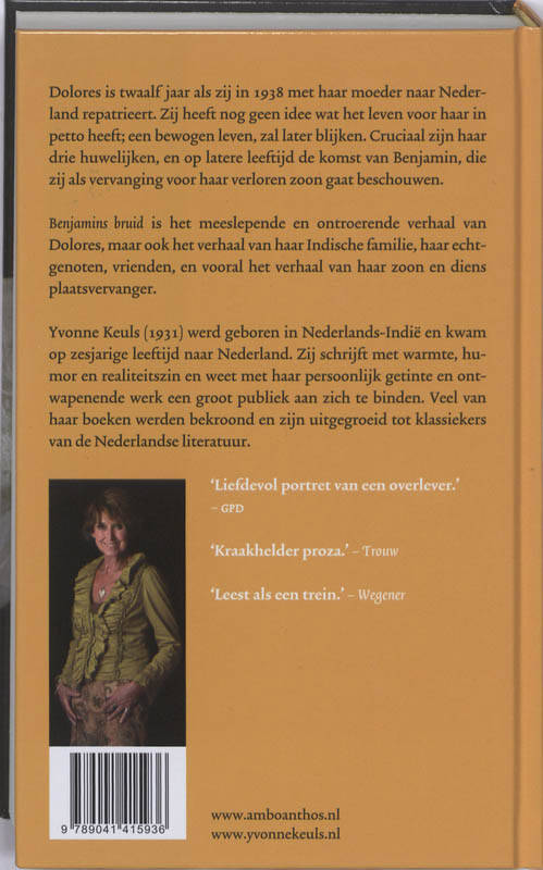 ‘Benjamins bruid’ is het meeslepende en ontroerende levensverhaal van Dolores, maar ook het verhaal van haar Indische familie, haar echtgenoten, vrienden, en vooral het verhaal van haar zoon en diens plaatsvervanger. Yvonne Keuls schetst op ontwapenende wijze een getroebleerde moeder-zoonrelatie en schuwt daarbij thema’s als dementie, homoseksualiteit en het feminisme niet, waarmee ze ook de tijdgeest van de jaren zestig, zeventig en tachtig van de vorige eeuw verbeeldt.