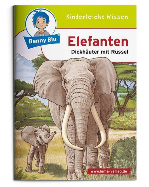 Riesen der Savanne. Benny Blu zeigt dir, wie afrikanische und asiatische Elefanten leben. Wer sind ihre Vorfahren? Wodurch unterscheiden sich die Elefantenarten? Wozu dient ihr Rüssel? Und welche Tiere sind mit dem Elefanten verwandt? Benny Blu Lernbuch, Format DIN A6, 32 Seiten, geheftet, 4/4 farbig
