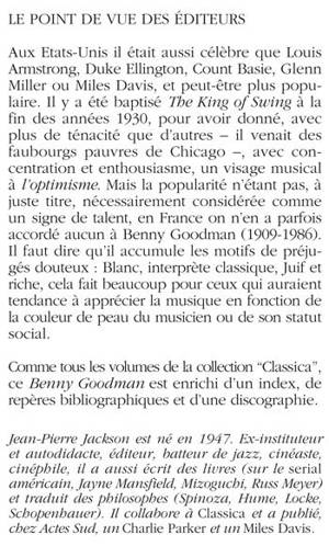 Dans le monde du jazz et dans le contexte politique qui l'entoure, celui qu'on a fini par appeler The King of Swing n'a pas toujours eu la vie -- ni la carrière -- facile. Blanc, interprète classique, juif et riche, Benny Goodman déparait. Pourtant, les clarinettistes de jazz l'ont vite considéré comme le meilleur d'entre eux. Et c'est lui qui, le premier, fait entrer le jazz dans les temples de la musique classique.