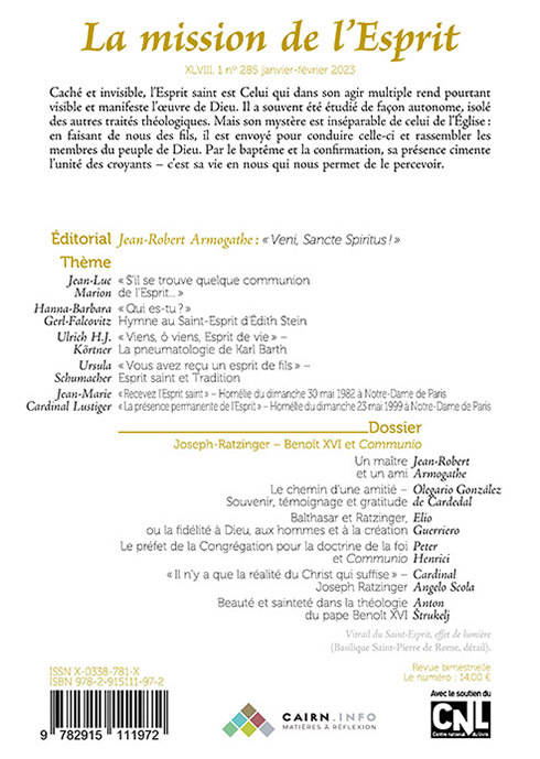 Caché et invisible, l'Esprit saint est Celui qui dans son agir multiple rend pourtant visible et manifeste l'oeuvre de Dieu. Il a souvent été étudié de façon autonome,isolé des autres traités théologiques.Mais son mystère est inséparable de celui de l'Eglise: en faisant de nous des fils, il est envoyé pour conduire celle-çi et rassembler les membres du peuple de Dieu. Par le baptême et la confirmation , sa présence cimente l'unité des croyants- c'est sa vie en nous qui permet de le percevoir.