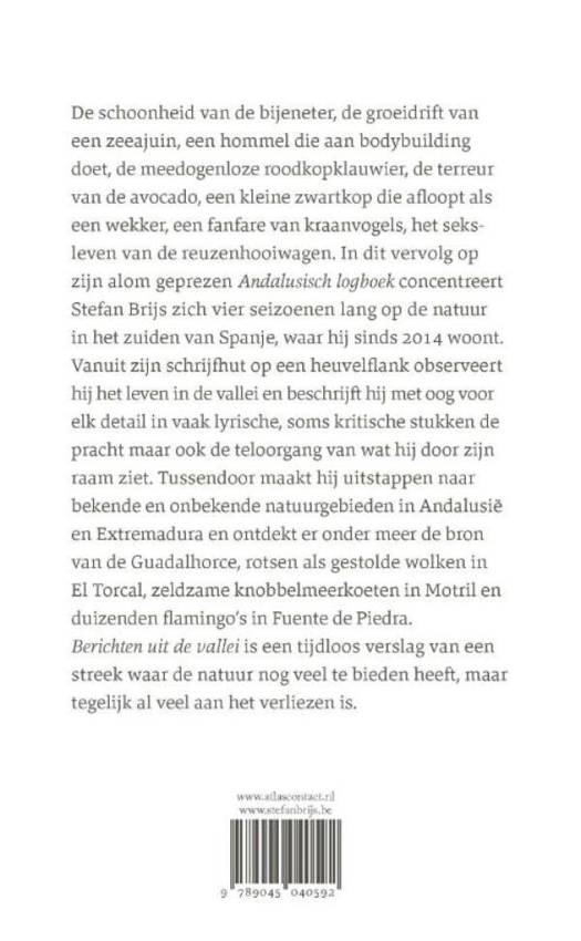 ‘Berichten uit de vallei’ van Stefan Brijs is een tijdloos verslag van een streek waar de natuur nog veel te bieden heeft, maar tegelijk al veel aan het verliezen is. In dit vervolg van het alom geprezen ‘Andalusisch logboek’ concentreert Brijs zich in vier seizoenen lang op de natuur in het zuiden van Spanje, waar hij sinds 2014 woont. Vanuit zijn schrijfhut op een heuvelflank observeert hij het leven in de vallei en beschrijft hij met oog voor elk detail in vaak lyrische, soms kritische stukken de pracht maar ook de teloorgang van wat hij door zijn raam ziet.