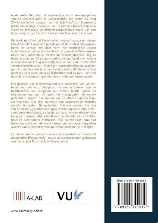 In de reeks Berichten uit Venserpolder wordt verslag gedaan van de wijkrechtbank in Venserpolder, die onder de vlag ZO=Venserpolder samen met het WijkActieTeam (gemeente, politie en woningcorporaties), het Buurtteam (maatschappelijk werk) en bewoners en bewonersorganisaties werkt aan een Community Justice Center in het hart van Amsterdam Zuidoost. Dit boek Berichten uit Venserpolder: wijkrechtspraak en wijkenbeleid benadert wijkrechtspraak vanuit de context van wijkenbeleid en schetst hoe deze vorm van rechtspraak recent onderdeel van nationaal wijkenbeleid is geworden. Waar wijkenbeleid zich aanvankelijk richtte op ‘stenen stapelen’, lag de focus in de jaren ’90 op een combinatie van fysieke en sociale interventies en kreeg ook veiligheid er een plek. Sinds 2022 vormt wijkrechtspraak – in de kern laagdrempelige, oplossingsgerichte rechtspraak in samenwerking met justitiële en sociale partners en in aansluiting op (behoeften van) de wijk – één van de onderscheidende ingrediënten van nationaal wijkenbeleid. Het gegeven dat wijkrechtspraak als onderdeel van wijkenbeleid een rol wordt toegedicht in het verbeteren van de (leefbaarheid en) veiligheid van wijken, leidde tijdens de totstandkoming van dit boek tot vraagpunten en eerste gedachten omtrent het ‘meten’ van de effectiviteit van wijkrechtspraak. Hier lijkt namelijk een zogenoemde evidence paradox te spelen. De gedachten hierover vormen het slot van dit boek. Zij stellen een open, brede kijk voor, vanuit verschillende disciplines, op basis van data verzameld over een lange(re) periode. Aldus biedt een combinatie van kwantitatieve en kwalitatieve methoden, met ruimte voor input van lokaal betrokkenen, de beste kansen om de maatschappelijke waarde van wijkrechtspraak op termijn inzichtelijk te maken. Esther van Voorst is docentonderzoeker aan de Vrije Universiteit Amsterdam (Privaatrecht) en als actieonderzoeker verbonden aan het project Buurtrechter Venserpolder.