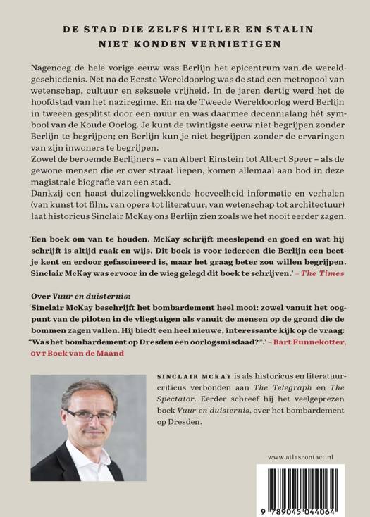 In ‘Berlijn’ laat historicus Sinclair McKay dankzij een haast duizelingwekkende hoeveelheid informatie en verhalen (van kunst tot film, van opera tot literatuur, van wetenschap tot architectuur) ons de stad zien zoals we haar nooit eerder zagen. Nagenoeg de hele vorige eeuw was Berlijn het epicentrum van de wereldgeschiedenis. Net na de Eerste Wereldoorlog was de stad een metropool van wetenschap, cultuur en seksuele vrijheid, in de jaren dertig werd het de hoofdstad van het naziregime. En na de Tweede Wereldoorlog werd Berlijn in tweeën gesplitst door een muur en was daarmee decennialang hét symbool van de Koude Oorlog. Je kunt de twintigste eeuw niet begrijpen zonder Berlijn te begrijpen; en Berlijn kun je niet begrijpen zonder de ervaringen van haar inwoners te begrijpen.