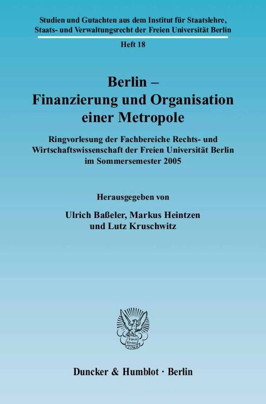 Der Band fasst in leicht überarbeiteter Form elf Vorträge zusammen, die im Sommersemester 2005 an der Freien Universität Berlin gehalten worden sind. Die Vorträge lassen sich in drei Gruppen bündeln: Vorträge von Politikern, ökonomisch-verwaltungswissenschaftliche Vorträge, juristische Vorträge. Die Berliner Senatoren Sarrazin - abgedruckt ist einer seiner "Folienvorträge" - und Wolf stellen die finanzielle und wirtschaftliche Situation Berlins und ihre Perspektiven aus der Sicht des Landes, der Staatssekretär im Bundesfinanzministerium Halsch aus der Sicht des Bundes dar. Der Bundestagsabgeordnete W. Wieland beschäftigt sich mit der föderalen Neugliederung im Raum Berlin/Brandenburg, der Unternehmer Dussmann mit der privaten Finanzierung der überfälligen Sanierung der Staatsoper Unter den Linden. Im engeren Sinne juristische Fragen behandeln J. Wieland (extreme Haushaltsnotlage Berlins) und Andreas Musil (bezirkliche Selbstverwaltung). Dem Topos "Metropole" gelten die Beiträge von Röber (Vergleich der Verwaltungen europäischer Metropolen) und Schuppert (Metropolitan Governance). Michael Heine und Manfred Seitz befassen sich aus wirtschaftswissenschaftlicher Sicht mit den Finanzen von Berlin. Die Beiträge erheben keinen systematischen Anspruch, sondern heben hervor, was den Herausgebern in der dritten Phase der Berliner Finanzpolitik nach der Wiedervereinigung (erst übertriebene Erwartungen, dann Fortsetzung des alten Kurses, jetzt Konsolidierung) als wichtig erschienen ist.