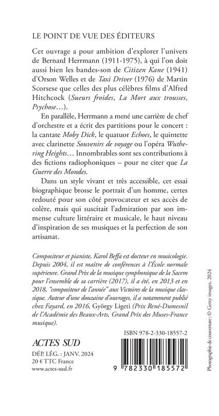Cet ouvrage a pour ambition d'explorer l'univers de Bernard Herrmann (1911-1975), à qui l'on doit aussi bien les bandes-son de Citizen Kane (1941) d'Orson Welles et de Taxi Driver (1976) de Martin Scorsese que celles des plus célèbres films d'Alfred Hitchcock (Sueurs froides, La Mort aux trousses, Psychose...). En parallèle, Herrmann a mené une carrière de chef d'orchestre et a écrit des partitions pour le concert : la cantate Moby Dick, le quatuor Echoes, le quintette avec clarinette Souvenirs de voyage ou l'opéra Wuthering Heights... Innombrables sont ses contributions à des fictions radiophoniques - pour ne citer que La Guerre des Mondes. Dans un style vivant et très accessible, cet essai biographique brosse le portrait d'un homme, certes redouté pour son côté provocateur et ses accès de colère, mais qui suscitait l'admiration par son immense culture littéraire et musicale, le haut niveau d'inspiration de ses musiques et la perfection de son artisanat.