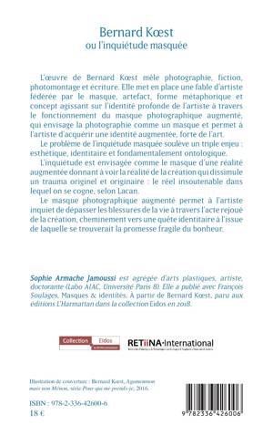L'oeuvre de Bernard Koest mêle photographie, fiction, photomontage et écriture. Elle met en place une fable d'artiste fédérée par le masque, artefact, forme métaphorique et concept agissant sur l'identité profonde de l'artiste à travers le fonctionnement du masque photographique augmenté, qui envisage la photographie comme un masque et permet à l'artiste d'acquérir une identité augmentée, forte de l'art. Le problème de l'inquiétude masquée soulève un triple enjeu: esthétique, identitaire et fondamentalement ontologique. L'inquiétude est envisagée comme le masque d'une réalité augmentée donnant à voir la réalité de la création qui dissimule un trauma originel et originaire: le réel insoutenable dans lequel on se cogne, selon Lacan. Le masque photographique augmenté permet à l'artiste inquiet de dépasser les blessures de la vie à travers l'acte rejoué de la création, cheminement vers une quête identitaire à l'issue de laquelle se trouverait la promesse fragile du bonheur.