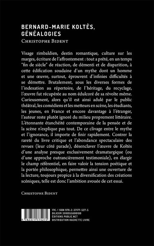 Visage rimbaldien, destin romantique, culture sur les marges, écriture de l’affrontement : tout a prêté, en un temps “fin de siècle” de réaction, de démenti et de disparition, à cette édification soudaine d’un mythe dont un homme et une oeuvre, surtout, éprouvent d’infinies difficultés à se démettre. Brutalement, sous les diverses formes de l’indexation au répertoire, de l’héritage, du recyclage, l’oeuvre fut récupérée au nom édulcoré de sa révolte même. Curieusement, alors qu’il est ainsi adulé par le public théâtral, les comédiens et les metteurs en scène, les étudiants, les jeunes, en France et encore davantage à l’étranger, l’auteur reste plutôt ignoré du milieu proprement littéraire. L’étonnante étanchéité contemporaine de la pensée et de la scène n’explique pas tout. De ce clivage entre le mythe et l’ignorance, il importe de finir rapidement. Contrer la rareté du livre critique et l’abondance spectaculaire des revues (leur côté parade), désenclaver l’oeuvre de Koltès d’une analyse presque exclusivement dramaturgique (ou d’une approche outrancièrement testimoniale), en élargir le champ référentiel, en faire valoir la tension poétique et la portée philosophique, permettre ainsi une ouverture de la lecture, toujours propice à la diversification des créations scéniques, telle est donc l’ambition avouée de cet essai. Christophe Bident