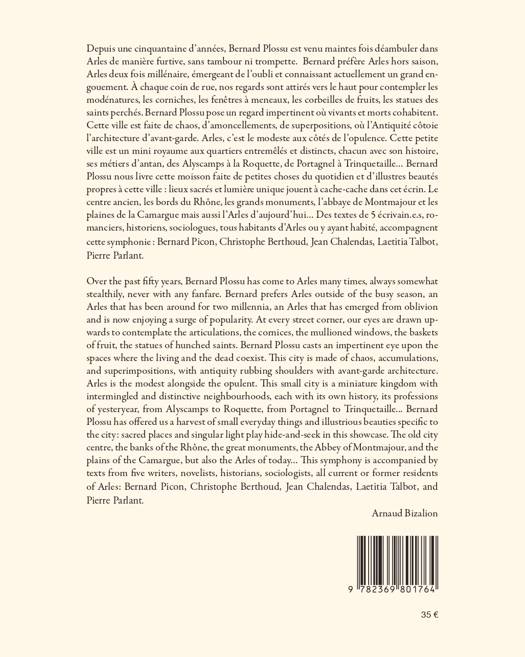 Depuis 50 ans, le photographe Bernard Plossu pose son regard sur la ville d’Arles deux fois millénaire. Un regard contemporain sur l’illustre passé et sur les deux siècles traversés : 20ème et 21ème. Bernard Plossu nous livre cette moisson faîte de petites choses du quotidien et d’illustres beautés propres à cette ville : lieux sacrés, lumière unique, ombres et lumière jouent à cache cache dans cet écrin. Le centre ancien, les Alyscamps, le musée réattu, le musée arlaten, les bords du rhône, les grands monuments, mais aussi, l’Arles d’aujourd’hui ainsi que l’abbaye de Montmajour et les plaines de la Camargue. Des textes d’écrivains, romanciers, historiens accompagnent cette symphonie.<br /><br />