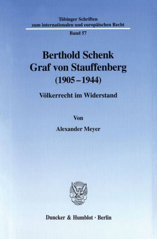 Berthold Graf Stauffenberg (1905-1944), älterer Bruder des Hitler-Attentäters vom 20. Juli 1944, war eine Persönlichkeit von eigenem Rang, die sich unabhängig von diesem zur Widerstandstätigkeit gegen das NS-Regime entschloß, und ein herausragender Jurist, der sich auf dem Gebiet des Völkerrechts durch viel beachtete Veröffentlichungen einen glänzenden Ruf erwarb.Im ersten Teil der Arbeit beschäftigt sich der Autor mit Person und Persönlichkeit, beruflichem Werdegang und dem Weg Berthold Graf Stauffenbergs in den aktiven Widerstand gegen die Regierung Adolf Hitler. Die Erfahrungen der Jugend- und Studentenzeit, die Arbeiten am Kaiser-Wilhelm-Institut für ausländisches öffentliches Recht und Völkerrecht, in diversen kriegsrechtlichen Ausschüssen und im Oberkommando der Kriegsmarine sowie die Beteiligung Berthold Graf Stauffenbergs an der Umsturzplanung bilden den Schwerpunkt dieses Abschnitts. Daraufhin stellt Alexander Meyer die Entwicklung der internationalen Schiedsgerichtsbarkeit und internationalen Gerichtsbarkeit sowie die Tätigkeit Berthold Graf Stauffenbergs am Ständigen Internationalen Gerichtshof des Völkerbundes dar. Dieser Teil der Arbeit ist geprägt von Berthold Graf Stauffenbergs größtem juristischen Werk, dem Kommentar des Statuts und des Reglements des Gerichtshofes, und von wichtigen völkerrechtlichen Entscheidungen des Gerichtshofes, die teilweise von Berthold Graf Stauffenberg einer kritischen Betrachtung unterzogen wurden. Schließlich befaßt sich der Autor mit dem Seekriegs- und Prisenrecht. Neben der geschichtlichen Entwicklung wird vor allem das zweite große Werk Berthold Graf Stauffenbergs, die Prisenordnung von 1939, beleuchtet und untersucht. Die prisenrechtlichen Institute des Blockade-, Konterbande- und Seebeuterechts werden in ihrer theoretischen Ausgestaltung und ihrer praktischen Verwendung im Vergleich mit völkerrechtlichem Gewohnheitsrecht gemessen.