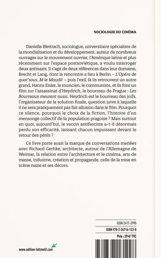 Danielle Bleitrach, sociologue, universitaire spécialiste de la mondialisation et du développement, auteur de nombreux ouvrages sur le mouvement ouvrier, l’Amérique latine et plus récemment sur l’espace postsoviétique, a voulu interroger deux antinazis. Il s’agit de deux références dans leur domaine, Brecht et Lang, dont la rencontre a lieu à Berlin – L’Opéra de quat’sous, M le Maudit – puis l’exil, là ils retrouvent un autre grand, Hanns Eisler, le musicien, le communiste, et ils font un film sur l’assassinat d’Heydrich, le bourreau de Prague : Les Bourreaux meurent aussi. Heydrich est le bourreau des juifs, l’organisateur de la solution finale, question juive à laquelle il ne sera pratiquement pas fait allusion dans le film. Pourquoi ce silence, pourquoi le choix de la fiction, l’histoire d’un mensonge collectif de la population pragoise ? Mais surtout en quoi, aujourd’hui, le vaccin antifasciste a-t-il désormais perdu son efficacité, laissant chacun impuissant devant le retour des périls ? Ce livre porte aussi la marque de conversations menées avec Richard Gerhke, architecte, autour de l’Allemagne de Weimar, la relation entre l’architecture et le cinéma, arts de masse, industrie, création et propagande, celle de la mise en scène nazie et ses décors.