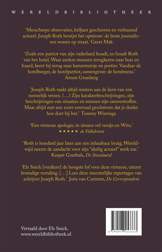 Roth lees je om zijn prachtige observaties, van die steden, maar vooral van hun bewoners, die hij beschrijft met ongeëvenaarde mensenkennis - en een recht evenredig gevoel voor humor., Trouw