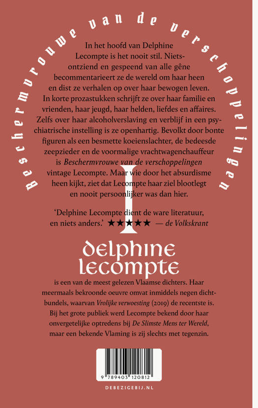 In Beschermvrouwe van de verschoppelingen trekt een bonte stoet outsiders voorbij. Rednecks, drank- en gokverslaafden en andere veelgeplaagde figuren kunnen op de sympathie van Lecompte rekenen, maar met corona besmette koeienslachters, benepen pezewezers en moraalridders kunnen haar rug op en worden getrakteerd op een middelvinger in het aangezicht. Tussen het weldadige absurdisme door is er steeds de kwets- bare ondertoon. Wie goed oplet, ziet dat Lecompte nooit persoonlijker was dan hier.