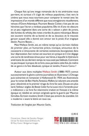 Chaque fois qu’une image romancée de la vie américaine nous parvient, et surtout s’il s’agit de milieux populaires, c’est vers le cinéma que nous nous tournons pour comparer le roman avec les impressions d’un monde différent que nous enregistrons visuellement, venues d’Outre Atlantique. Pourtant Bessie Cotter, n’est pas de ces héroïnes que l’écran a rendues populaires. Elle vit d’une vie obscure et un peu végétative dans une sorte de « saloon » plein de jurons, des fumées du whisky, des notes criardes du piano mécanique. Bessie est souvent victime de sa bonté et de sa douceur, et le mauvais garçon auquel elle a donné son amour est la proie d’un tragique destin. Pauvre Bessie…