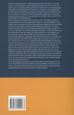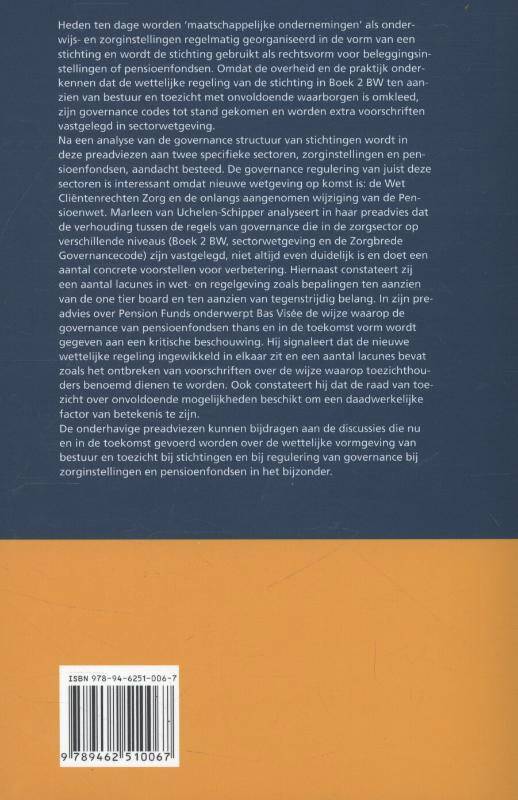 Na een analyse van de governance structuur van stichtingen wordt in deze preadviezen aan twee specifieke sectoren, zorginstellingen en pensioenfondsen, aandacht besteed. De governance regulering van juist deze sectoren is interessant omdat nieuwe wetgeving op komst is: de Wet Cliëntenrechten Zorg en de onlangs aangenomen wijziging van de Pensioenwet.