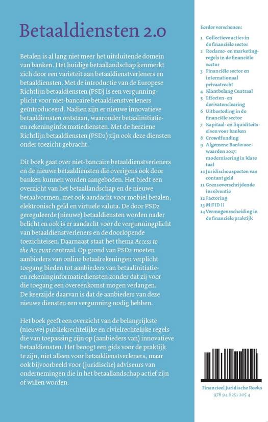 Dit boek gaat over niet-bancaire betaaldienstverleners en de nieuwe betaaldiensten die overigens ook door banken kunnen worden aangeboden. Het biedt een overzicht van het betaallandschap en de nieuwe betaalvormen, met ook aandacht voor mobiel betalen, elektronisch geld en virtuele valuta. De door PSD2 gereguleerde (nieuwe) betaaldiensten worden nader belicht en ook is er aandacht voor de vergunningplicht van betaaldienstverleners en de doorlopende toezichteisen. Daarnaast staat het thema Access to the Account centraal. Op grond van PSD2 moeten aanbieders van online betaalrekeningen verplicht toegang bieden tot aanbieders van betaalinitiatie- en rekeninginformatiediensten zonder dat zij voor die toegang een overeenkomst mogen verlangen. De keerzijde daarvan is dat de aanbieders van deze nieuwe diensten een vergunning nodig hebben.