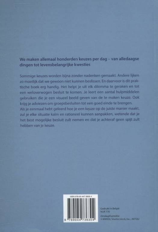 Sommige keuzes worden bijna zonder nadenken gemaakt. Andere lijken zo moeilijk dat we gewoon niet kunnen beslissen. En daarvoor is dit praktische boek erg handig. Het helpt je uit elk dilemma te geraken en tot een weloverwogen besluit te komen. Je leert een aantal hulpmiddelen gebruiken die je een visueel beeld geven van de te maken keuze. Ook krijg je adviezen om groepsbesluiten tot een goed einde te brengen. Als je eenmaal hebt geleerd hoe je een keuze op de juiste manier maakt, zul je elke situatie kalm en rationeel kunnen aanpakken, wetende dat je het best mogelijke besluit zult nemen en dat je achteraf geen spijt zult hebben van je keuze.