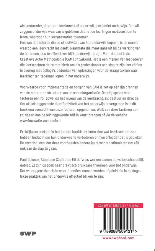 Als bestuurder, directeur, leerkracht of ouder wil je effectief onderwijs. Dat wil zeggen: onderwijs waarvan is gebleken dat het de leerlingen motiveert om te leren, waardoor hun leerprestaties toenemen. Een van de factoren die de effectiviteit van het onderwijs bepaalt, is de manier waarop een leerkracht les geeft. Naarmate die meer aansluit bij de werking van de hersenen, des te effectiever blijkt onderwijs te zijn. Voor dit doel is de Creatieve Actie Methodologie (CAM) ontwikkeld. Het is een manier van lesgegeven die leerkrachten de ruimte biedt om als professionals aan slag te zijn: het zélf en in overleg met collega’s bedenken van oplossingen voor de vraagstukken waar leerkrachten tegenaan lopen in het onderwijs.