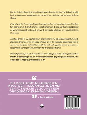 Slaap je slecht? Val je moeilijk in slaap? Of lig je 's nachts wakker? Met 'Beter slapen doe je zo' is dat verleden tijd. In dit tweede deel in de Doe je zo-serie, gaat GZ-psycholoog en auteur Arentina Drenth in op de oorzaken van slaapproblemen en helpt ze je deze op te lossen. Zo stel je met de handige adviezen en tips in dit boek een actieplan op, waardoor je beter leert te slapen. In simpele taal, aangevuld met mooie illustraties, legt Drenth uit hoe je met allerlei oefeningen, tips en tricks je slapeloze nachten kunt tackelen. De eenvoudig uitgelegde theorie, gebaseerd op wetenschappelijk onderzoek, kan iedereen gemakkelijk begrijpen én toepassen. 'Beter slapen doe je zo' is een onmisbaar boek voor op ieder nachtkastje.