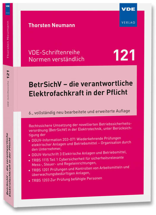 Die Betriebssicherheitsverordnung (BetrSichV) ist für jede Elektrofachkraft eine praxisbewährte Rechtsgrundlage bezüglich elektrischer Gefahren bei der Verwendung von Arbeitsmitteln. In diesem Buch wird dargelegt, welche Pflichten zu erfüllen sind und wie diese für elektrische Betriebsmittel/Geräte und elektrische Anlagen/Maschinenausrüstungen auf der Grundlage der Vorgaben der BetrSichV umgesetzt werden können. Es ist ein besonderes Anliegen des Autors, aufzuzeigen, dass, mit dem auf diese Weise vorbildlich praktizierten Bemühen um den Arbeitsschutz für die Beschäftigten und Dritte, Konflikte vermieden und Kosten eingespart werden können.Das nunmehr in der 6. Auflage vorliegende Werk beantwortet im Arbeitsalltag der verantwortlichen Elektrofachkraft auftauchende Fragen aus praktischer Sicht:- Wie stehen BetrSichV, TRBS und DGUV-Vorschrift 3 zueinander?- Was bringt die BetrSichV dem Anwender und wo sind Probleme, speziell bei den elektrischen Arbeitsmitteln, zu erwarten?- Wozu ist die Gefährdungsbeurteilung gut?Es wird die Umsetzung der BetrSichV speziell mit Blick auf elektrische Arbeitsmittel beschrieben, Musterformulare werden bereitgestellt, und viele Beispiele verdeutlichen die Probleme und Chancen. Die für die Elektrofachkraft wichtigen Teile der BetrSichV und der DGUV-Vorschrift 3/TRBS sind in der neuesten Fassung komplett im Buch wiedergegeben. Dem Thema Cybersicherheit im Zusammenhang mit der TRBS 1115 Teil 1 wurde ein eigenes Kapitel gewidmet, ein Ausblick auf Fragestellungen zur Künstlichen Intelligenz (KI) rundet das Buch ab.