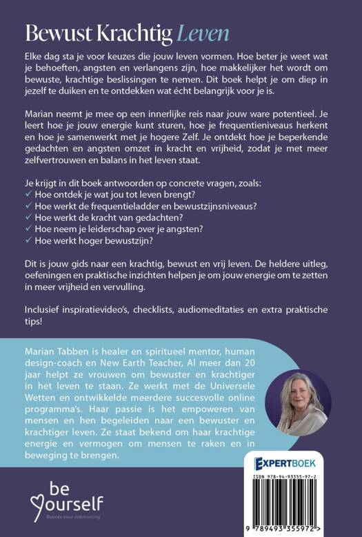 Dit is jouw gids naar een krachtig, bewust en vrij leven. De heldere uitleg, oefeningen en praktische inzichten helpen je om jouw energie om te zetten in meer vrijheid en vervulling.Inclusief inspiratievideo’s, checklists, audiomeditaties en extra praktische tips!Marian Tabben is healer en spiritueel mentor, human design-coach en New Earth Teacher. Al meer dan 20 jaar helpt ze vrouwen om bewuster en krachtiger in het leven te staan. Ze werkt met de Universele Wetten en ontwikkelde meerdere succesvolle online programma’s. Haar passie is het empoweren van mensen en hen begeleiden naar een bewuster en krachtiger leven. Ze staat bekend om haar krachtige energie en vermogen om mensen te raken en in beweging te brengen.