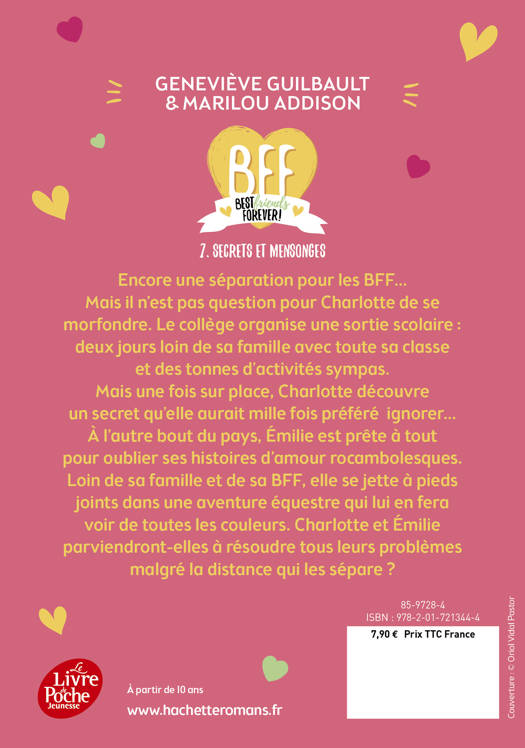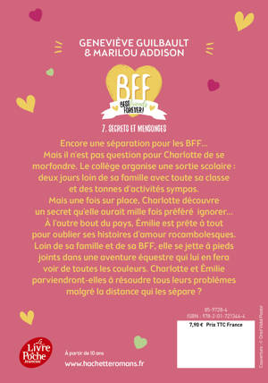 Encore une séparation pour les BFF… Mais il n’est pas question pour Charlotte de se morfondre. Le collège organise une sortie scolaire des plus amusantes en ce début d’hiver : deux jours loin de sa famille avec toute sa classe et plein d’activités sympas. Mais une fois sur place, Charlotte découvre un secret qu’elle aurait mille fois préféré ne pas savoir. À l’autre bout du pays, Émilie est prête à tout pour oublier ses histoires d’amour rocambolesques. Loin de sa famille et de sa BFF, elle se jette à pieds joints dans une aventure équestre qui lui en fera voir de toutes les couleurs. Charlotte et Émilie parviendront-elles à résoudre tous leurs problèmes malgré la distance qui les sépare ?