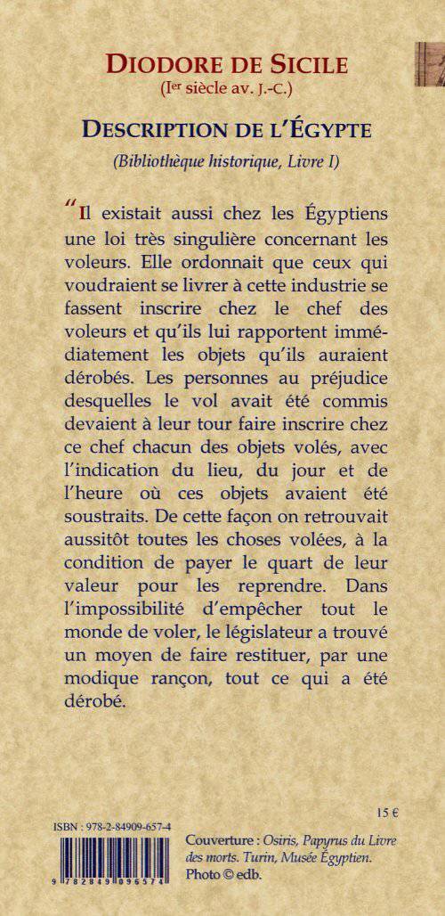 Il existait aussi chez les Égyptiens une loi très singulière concernant les voleurs. Elle ordonnait que ceux qui voudraient se livrer à cette industrie se fassent inscrire chez le chef des voleurs et qu'ils lui rapportent immédiatement les objets qu'ils auraient dérobés. Les personnes au préjudice desquelles le vol avait été commis devaient à leur tour faire inscrire chez ce chef chacun des objets volés, avec l'indication du lieu, du jour et de l'heure où ces objets avaient été soustraits. De cette façon on retrouvait aussitôt toutes les choses volées, à la condition de payer le quart de leur valeur pour les reprendre. Dans l'impossibilité d'empêcher tout le monde de voler, le législateur a trouvé un moyen de faire restituer, par une modique rançon, tout ce qui a été dérobé.