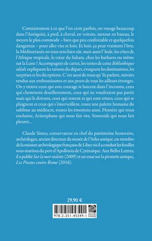 Contrairement à ce que l’on croit parfois, on voyage beaucoup dans l’Antiquité, à pied, à cheval, en voiture, surtout en bateau, le moyen le plus commode – bien que peu confortable et quelquefois dangereux – pour aller vite et loin. Et loin, ça peut vraiment l’être, la Méditerranée en tous sens bien sûr, mais aussi l’Inde, les côtes de l’Afrique tropicale, le coeur du Sahara, chez les barbares ou même sur la Lune ! Accompagnés de cartes, les textes de cette Bibliothèque idéale expliquent les raisons du départ, évoquent les destinations, les surprises et les déceptions. C’est aussi de nous qu’ils parlent, miroirs tendus aux enthousiasmes et aux peurs de tous les ailleurs étranges. On y trouve ceux qui avec courage se lancent dans l’inconnu, ceux qui cheminent douillettement, ceux qui ne voudraient pas partir mais qui le doivent, ceux qui restent et qui sont tristes, ceux qui se plaignent et ceux qui s’émerveillent, toute une palette humaine du sublime au médiocre, toutes les émotions aussi, Homère qui nous enchante, Aristophane qui nous fait rire, Simonide qui nous fait pleurer…