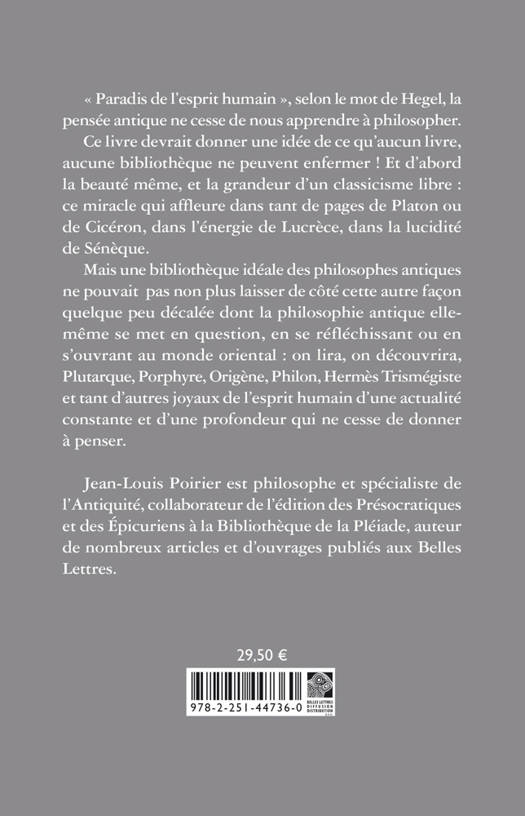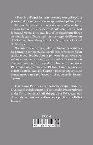 "Paradis de l'esprit humain", selon le mot de Hegel, la pensee antique ne cesse de nous apprendre a philosopher. Ce livre devrait donner une idee de ce qu'aucun livre, aucune bibliotheque ne peuvent enfermer ! Et d'abord la beaute meme, et la grandeur d'un classicisme libre: ce miracle qui affleure dans tant de pages de Platon ou de Ciceron, dans l'energie de Lucrece, dans la lucidite de Seneque. Mais une bibliotheque ideale des philosophes antiques ne pouvait pas non plus laisser de cote cette autre facon quelque peu decalee dont la philosophie antique elle-meme se met en question, en se reflechissant ou en s'ouvrant au monde oriental: on lira, on decouvrira, Plutarque, Porphyre, Origene, Philon, Hermes Trismegiste et tant d'autres joyaux de l'esprit humain d'une actualite constante et d'une profondeur qui ne cesse de donner a penser.