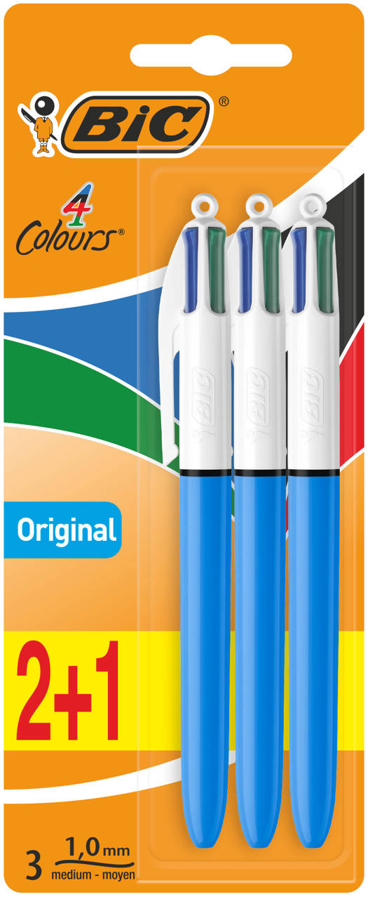 Navulbare en intrekbare balpen met medium punt. 4 Kleuren in 1 pen; zwart, blauw, rood en groen. Maximale schrijflengte van 8000 meter. Brede en ronde houder in blauw met een zachte en comfortabele grip. Punt van 1,0mm geeft een lijnbreedte van 0.4mm.