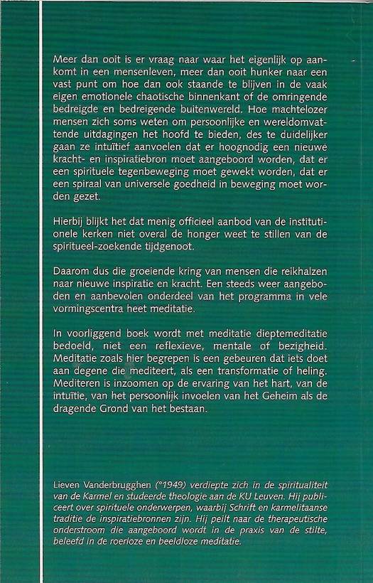 Er is een groeiende kring van mensen die reikhalzen naar nieuwe inspiratie en kracht. Een steeds weer aangeboden en aanbevolen onderdeel van het programma in vele vormingscentra heet meditatie. In dit boek wordt met meditatie dieptemeditatie bedoeld, niet een reflexieve, mentale of bezigheid. Meditatie is hier een gebeuren dat iets doet aan degene die mediteert, als een transformatie of heling. Mediteren is inzoomen op de ervaring van het hart, van de intuïtie, van het persoonlijk invoelen van het Geheim als de dragende Grond van het bestaan.