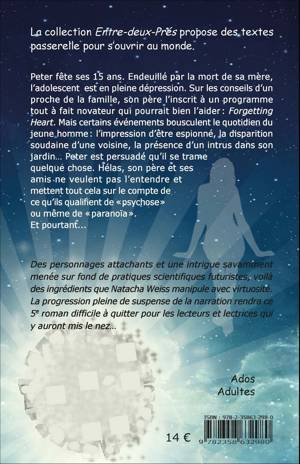 Peter fête ses 15 ans. Endeuillé par la mort de sa mère, l’adolescent est en pleine dépression. Sur les conseils d’un proche de la famille, son père l’inscrit à un programme tout à fait novateur qui pourrait bien l’aider : Forgetting Heart. Mais certains événements bousculent le quotidien du jeune homme : l’impression d’être espionné, la disparition soudaine d’une voisine, la présence d’un intrus dans son jardin… Peter est persuadé qu’il se trame quelque chose. Hélas, son père et ses amis ne veulent pas l’entendre et mettent tout cela sur le compte de ce qu’ils qualifient de « psychose » ou même de « paranoïa ». Et pourtant... - Des personnages attachants et une intrigue savamment menée sur fond de pratiques scientifiques futuristes, voilà des ingrédients que Natacha Weiss manipule avec virtuosité. Après Ils sont parmi nous, Minuit deux, Un ange en enfer et Projet Emmie, la progression pleine de suspense de la narration rendra ce 5e roman difficile à quitter pour les lecteurs et lectrices qui y auront mis le nez…