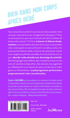 Ce livre, à travers 10 thèmes fondamentaux, vous permettra de savoir tout ce qui se passe dans votre corps après un accouchement. Les tabous autour du post-partum (hémorroïdes, cicatrice de césarienne, ventre mou, vergetures, périnée, sexualité, etc.) seront levés un à un, pour aborder cette période avec davantage de sérénité. Des témoignages bienveillants, des conseils tout doux sur les soins et soutiens à disposition, des astuces sans jugement sur l'allaitement ou la reprise du sport, et des focus indulgents sur l’alimentation : un joli programme qui favorisera progressivement votre reconstruction.