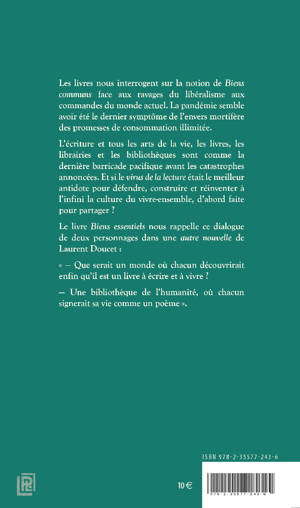 Une bibliothèque est un nom féminin parce qu’une bibliothèque est une nourriture et une jouissance Les livres nous interrogent sur la notion de Biens communs face aux ravages du libéralisme aux commandes du monde actuel. La pandémie semble avoir été le dernier symptôme de l’envers mortifère des promesses de consommation illimitée. L’écriture et tous les arts de la vie, les livres, les librairies et les bibliothèques sont comme la dernière barricade pacifique avant les catastrophes annoncées. Et si le virus de la lecture était le meilleur antidote pour défendre, construire et réinventer à l’infini la culture du vivre-ensemble, d’abord faite pour partager ? Le livre Biens essentiels nous rappelle ce dialogue de deux personnages dans une autre nouvelle de Laurent Doucet : « — Que serait un monde où chacun découvrirait enfin qu’il est un livre à écrire et à vivre ? — Une bibliothèque de l’humanité, où chacun signerait sa vie comme un poème ».