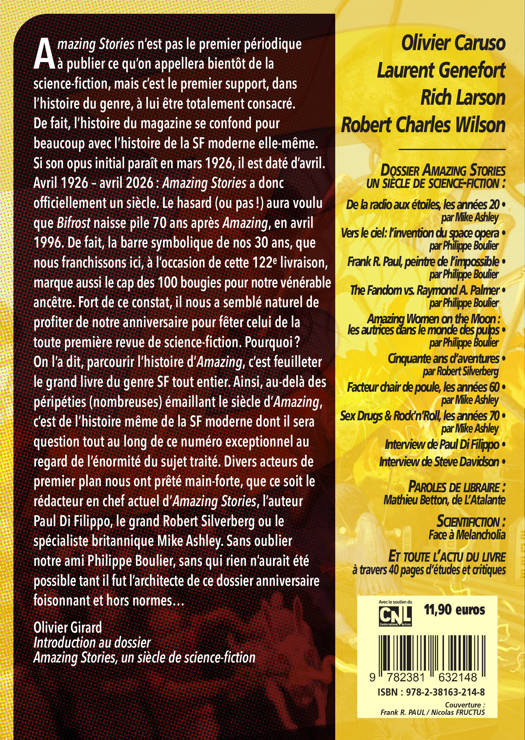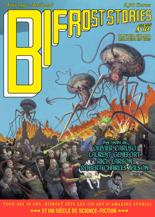 Pour ses 30 ans, l’iconique revue Bifrost fête une autre icone, Amazing Stories, premier magazine de l’histoire exclusivement consacré à la littérature de science-fiction, qui célèbre son siècle d’existence. Avril 1926 – avril 2026, soit un siècle d’histoire de la SF contemporaine abordé à travers le parcours tumultueux d’une revue dans laquelle le genre se fit — à tout le moins en partie. Des prémices à nos jours, de la naissance du space opera en passant par la place des femmes dans les pulps de l’Âge d’or, c’est ici le récit de la SF moderne que brosse « La revue des mondes imaginaires » par l’entremise d’un dossier exceptionnel qui n’oublie pas de donner la parole aux grands témoins de cette aventure littéraire sans pareil.