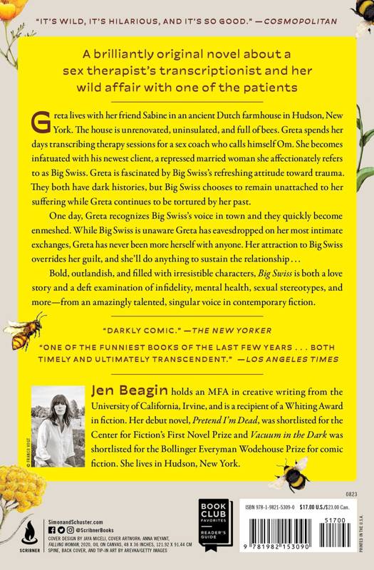 Greta lives with her friend Sabine in an ancient Dutch farmhouse in Hudson, New York. The house is unrenovated, uninsulated, and full of bees. Greta spends her days transcribing therapy sessions for a sex coach who calls himself Om. She becomes infatuated with his newest client, a repressed married woman she affectionately refers to as Big Swiss.
