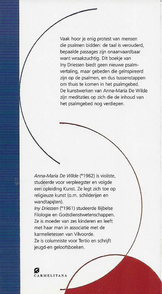 Vaak hoor je enig protest van mensen die psalmen bidden: de taal is verouderd, bepaalde passages zijn onaanvaardbaar want wraakzuchtig. Dit boekje van Iny Driessen biedt geen nieuwe psalmvertaling, maar gebeden die geïnspireerd zijn op de psalmen, en dus tussenstappen om thuis te komen in het psalmgebed. De kunstwerken van Anna-Maria De Wilde zijn meditaties op zich die de inhoud van het psalmgebed nog verdiepen.