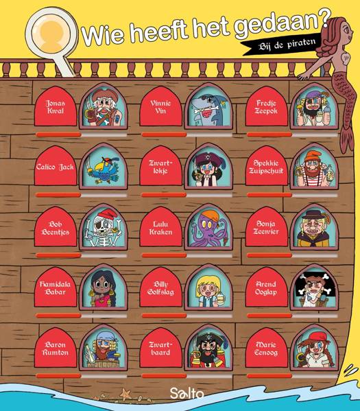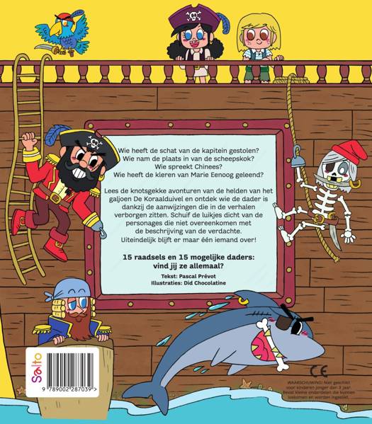 Wie heeft de schat van de kapitein gestolen?Wie nam de plaats in van de scheepskok?Wie spreekt Chinees?Wie heeft de kleren van Marie Eenoog geleend? Lees de knotsgekke avonturen van de helden van het galjoen De Koraalduivel en ontdek wie de dader is dankzij de aanwijzingen die in de verhalen verborgen zitten. Schuif de luikjes dicht van de personages die niet overeenkomen met de beschrijving van de verdachte.Uiteindelijk blijft er maar één iemand over! 15 raadsels en 15 mogelijke daders: vind jij ze allemaal?