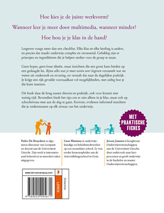 Geen hypes, geen losse ideeën, maar inzichten die een grote kans bieden op een geslaagde les. Bijna alles wat je moet weten over lesgeven verzamelt wat we weten uit onderzoek en ervaring, en vertaalt dat naar de dagelijkse praktijk. Je krijgt een rijk gevulde voorraadkast vol mogelijkheden, met uitleg hoe je die kunt inzetten.